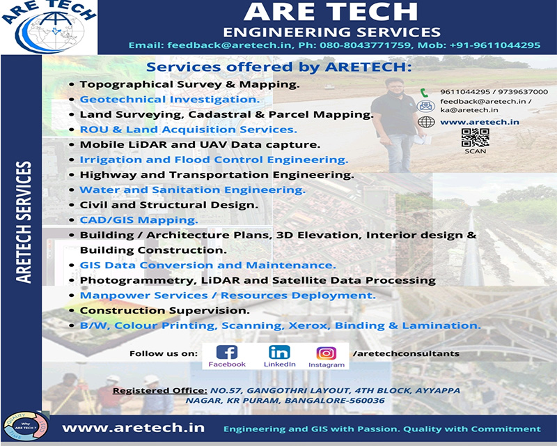 ARETECH offers Engineering Consultancy service such as, Topographical Survey, CAD / GIS Mapping, Geotechnical Investigation, GPR Survey, Cadastral / Revenue Survey, obtaining statutory Clearance, RoU activities, Land Acquisition, Roads & Highways Design, Irrigation Planning, UAV / Drone Survey & Videography, Photogrammetry, LiDAR & Satellite Data processing and Civil Constructions. ARETECH also provide Manpower Services for skilled jobs.